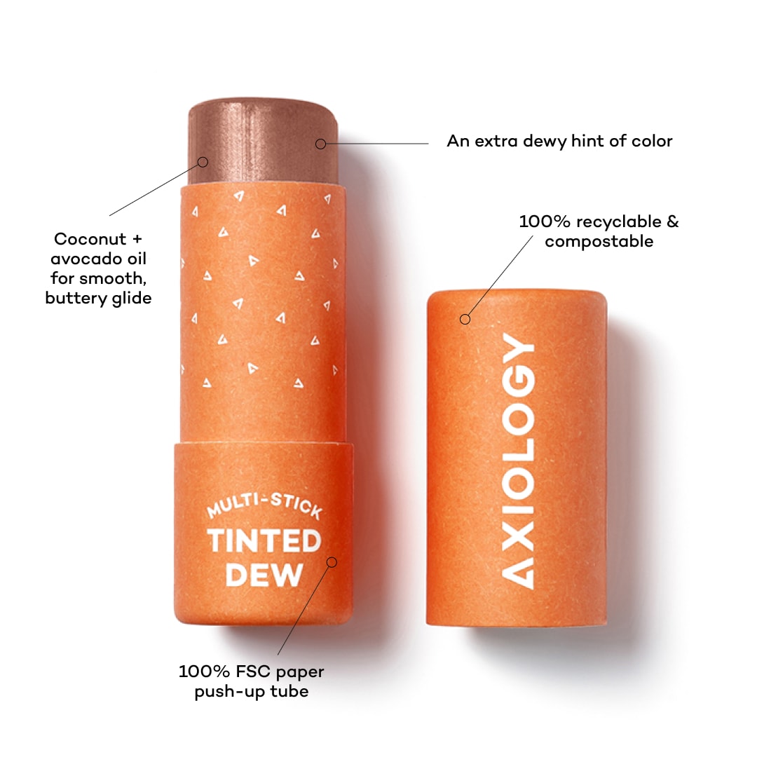 Plastic-free, tinted dew multi-sticks can be used anywhere on your face - perfect for eyes, lips and cheeks. To use, just push up tube and apply. Blend with fingers or brush. Get hydrating shine with a little sheer color, packed with oils, butter, and antioxidants, it's good for your skin!