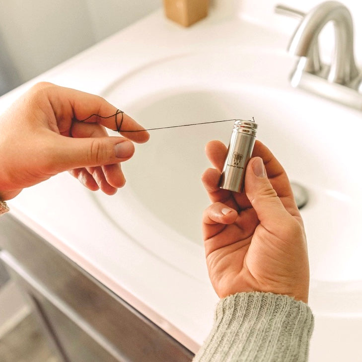 Vegan Bamboo Floss in Stainless Steel Dispenser