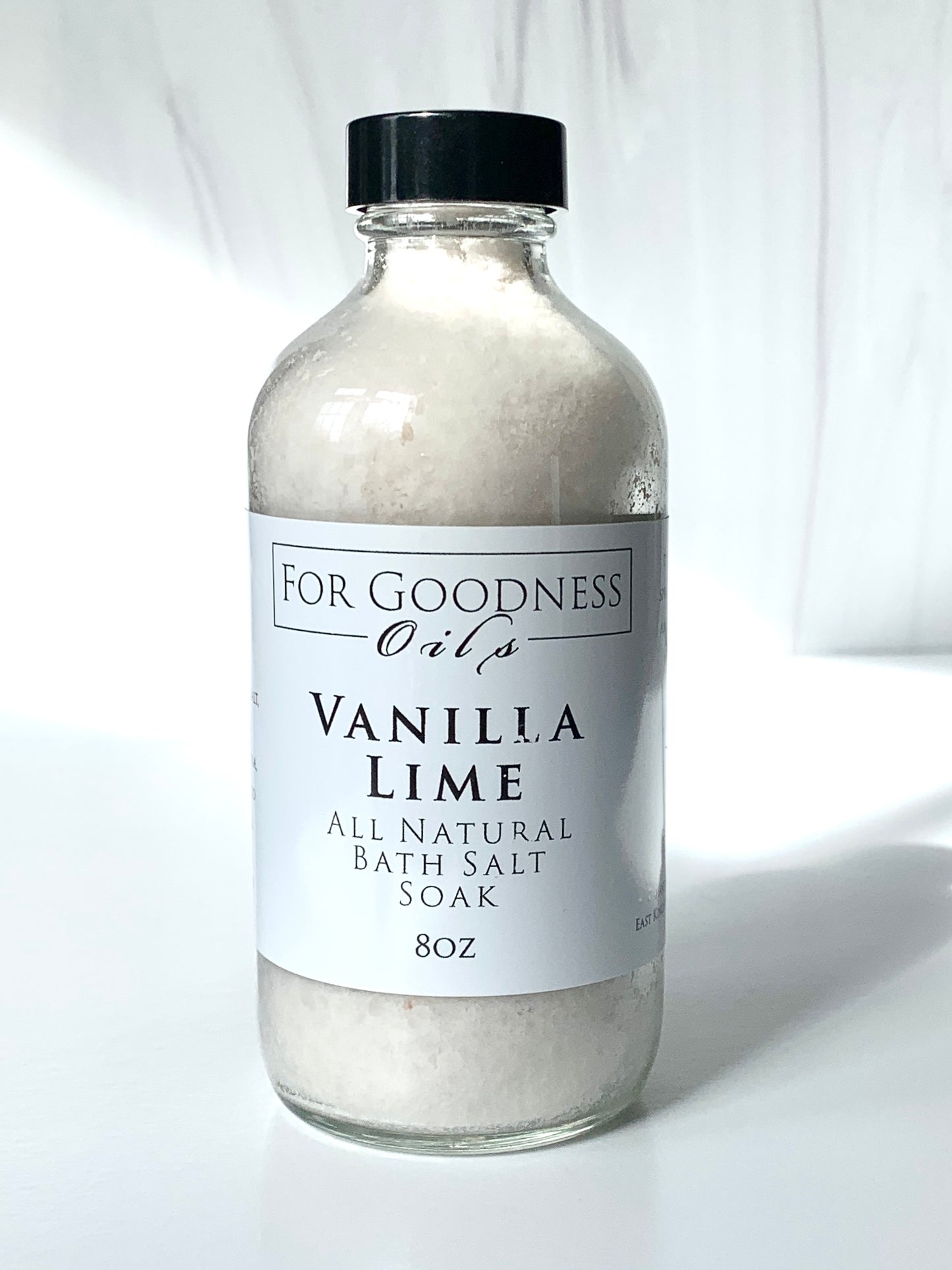 Ingredients: Epsom salt, baking soda, dead sea salt, pink himalayan salt; vanilla, lime, lavender, copaiba, and cedarwood essential oils.