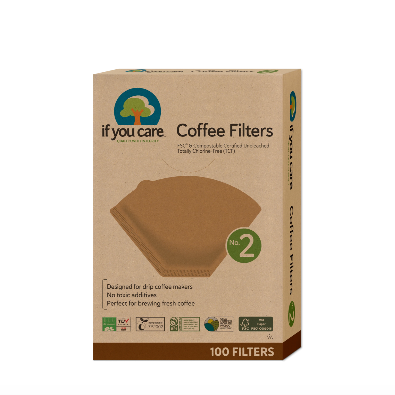 These compostable No. 2 paper coffee filters from If You Care are made from FSC (Forest Stewardship Council) paper which ensures responsible forestry, and rigorous environmental and social standards. The paper is unbleached, and totally chlorine-free, so they are 100% compostable, safe for both commercial or backyard composting.