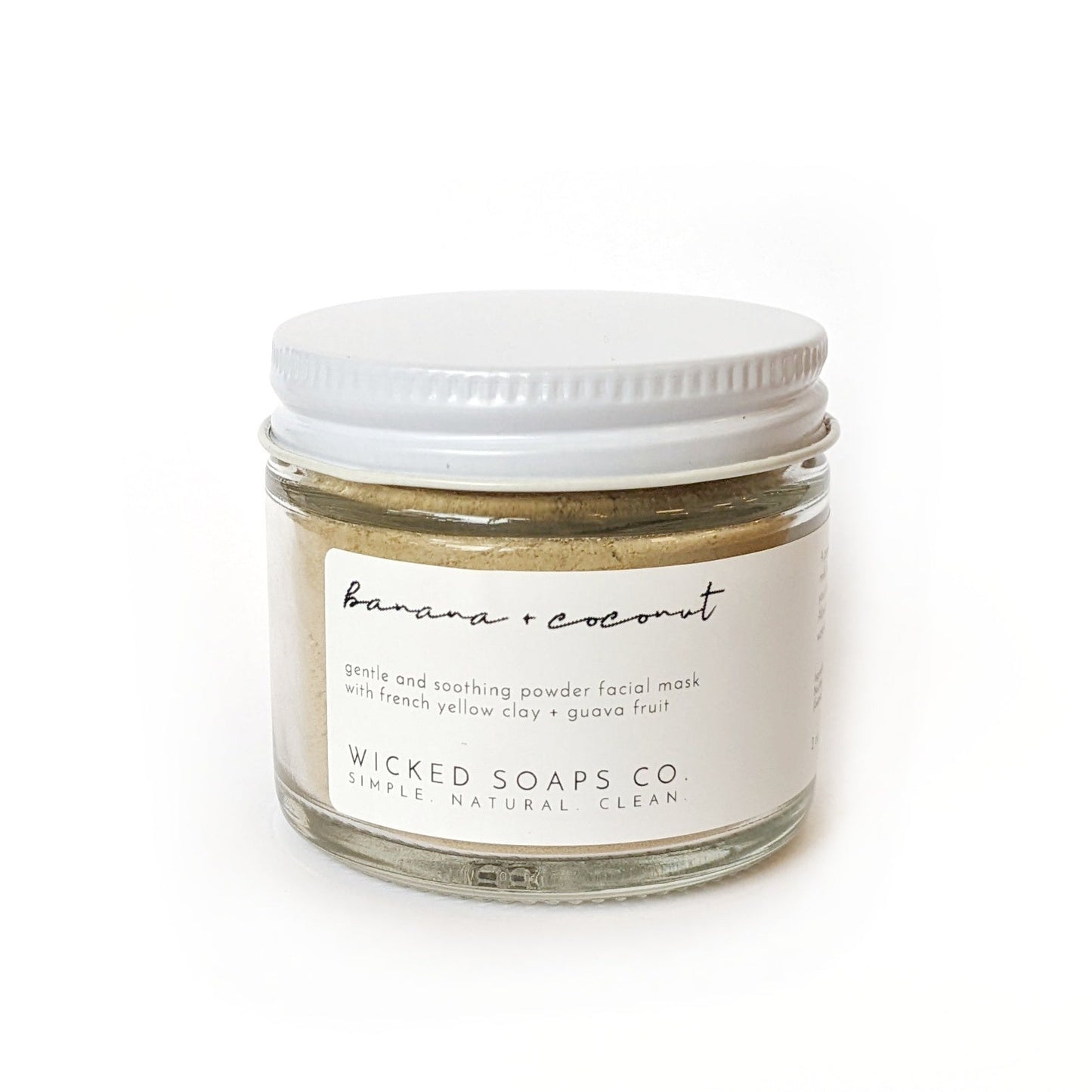 2 oz glass jar; Ingredients: Banana Extract Powder, *Coconut Milk Powder, French Yellow Clay, Guava Extract Powder *organic ingredient