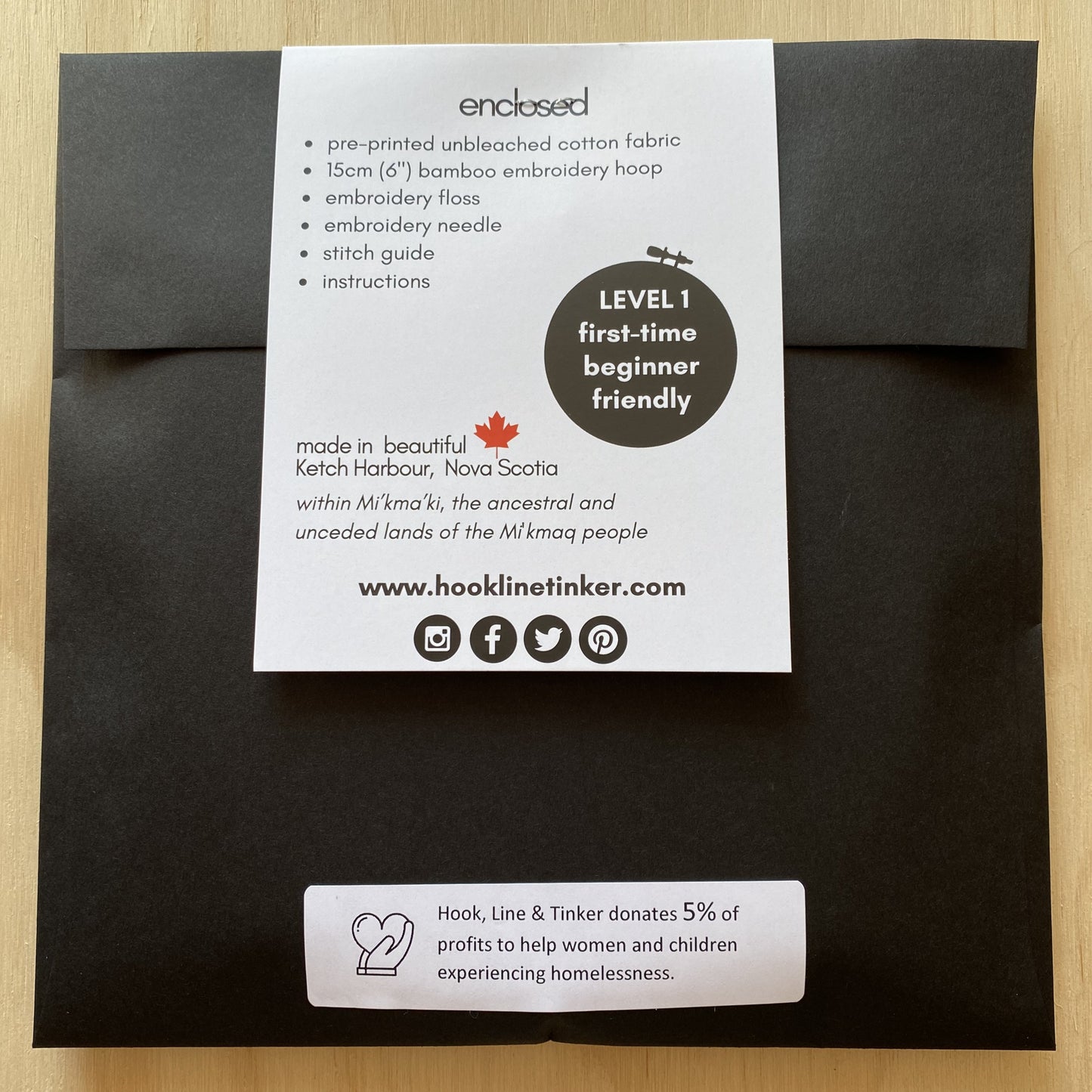 Designed, hand cut and printed in Ketch Harbour, Nova Scotia, this wonderful collection of embroidery kits is designed with recurring motifs and colors to be hung as finished hoops in mix-and-match groupings that work together, if desired.