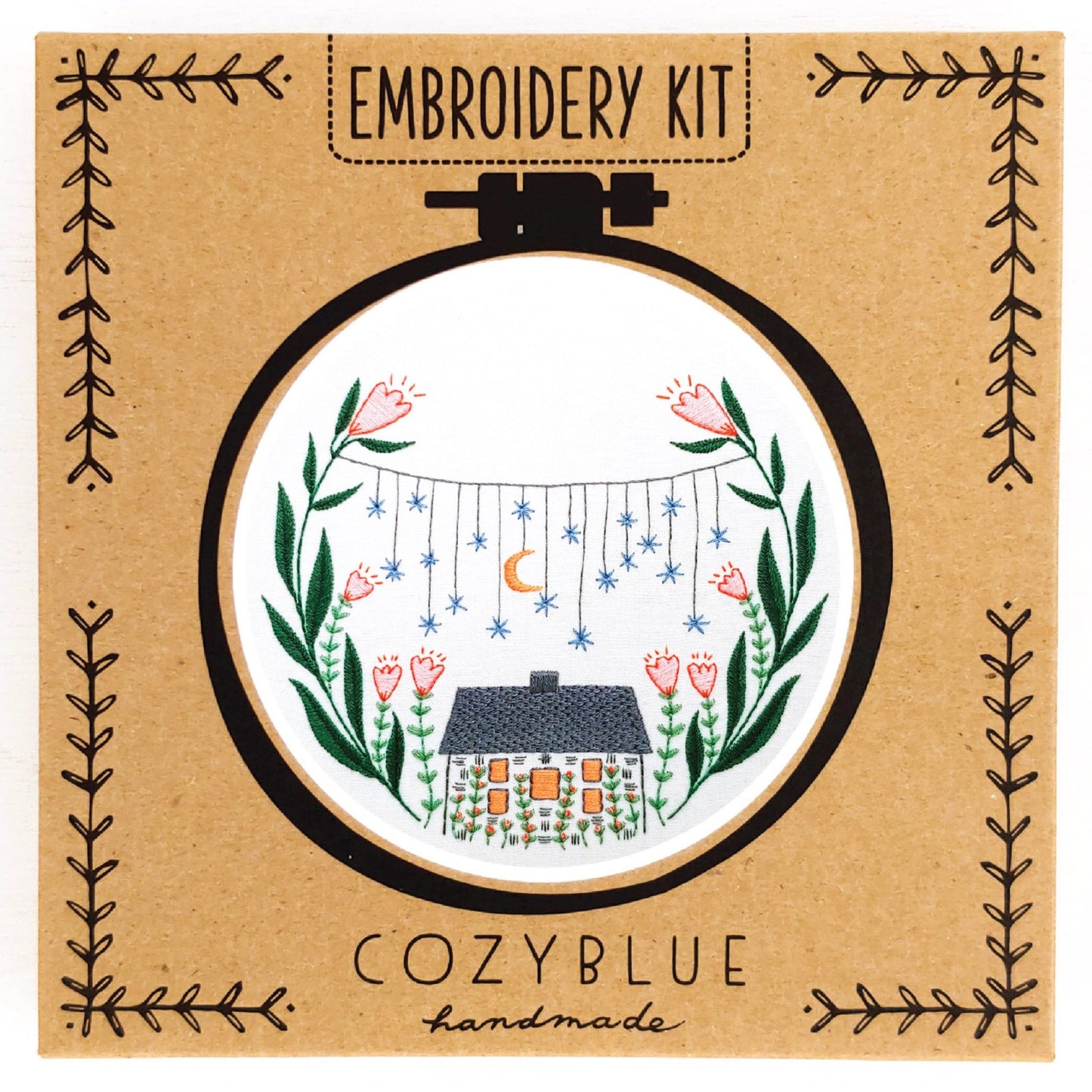 A great gift for crafters of all levels, or to make yourself - for gifting or to keep! This kit from cozyblue comes with everything you need: cotton fabric with printed pattern, wooden hoop, embroidery floss, needle, and instructions. You'll just need scissors to complete this sweet, original design. Just put the fabric on the hoop and you're ready to start crafting. The finished piece can simply be left in the hoop and hung on the wall, adding homey charm to any space, or sewn into a pillow, wall-hanging, or other fun project.