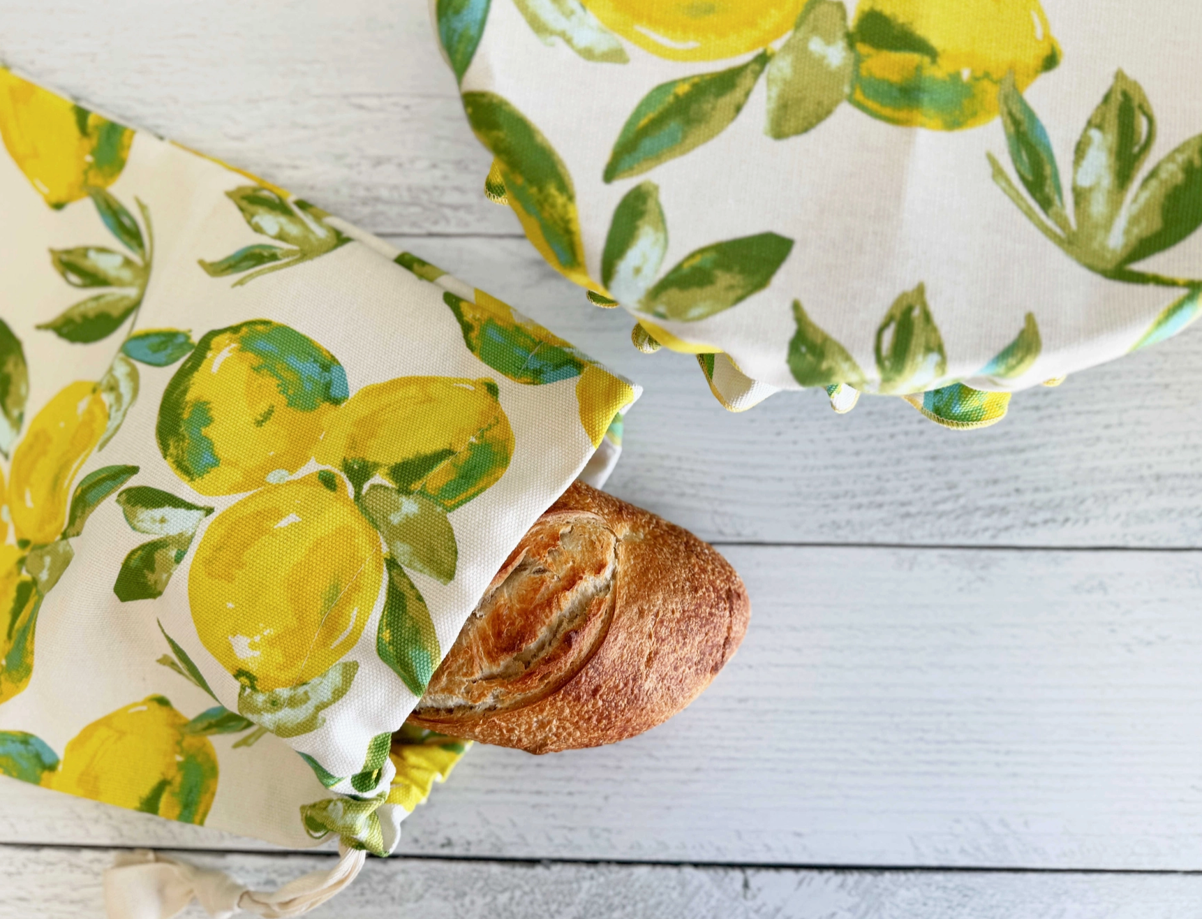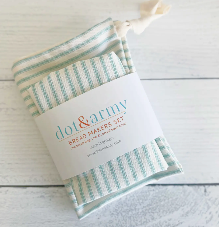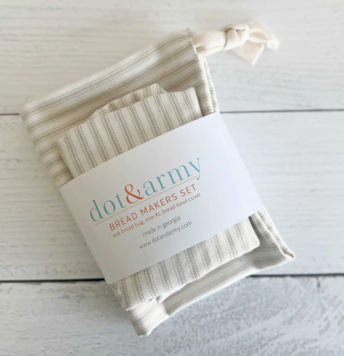 From Dot and Army comes this handmade bread makers set: A bowl cover for your rising dough (skip the plastic!) that fits a bowl up to 16 inches, and a bread bag to keep that baked loaf's crust nice and crisp. Perfect for the bread maker in your life (is it you?). Bread bag is 12 x 16" and closes with a drawstring.