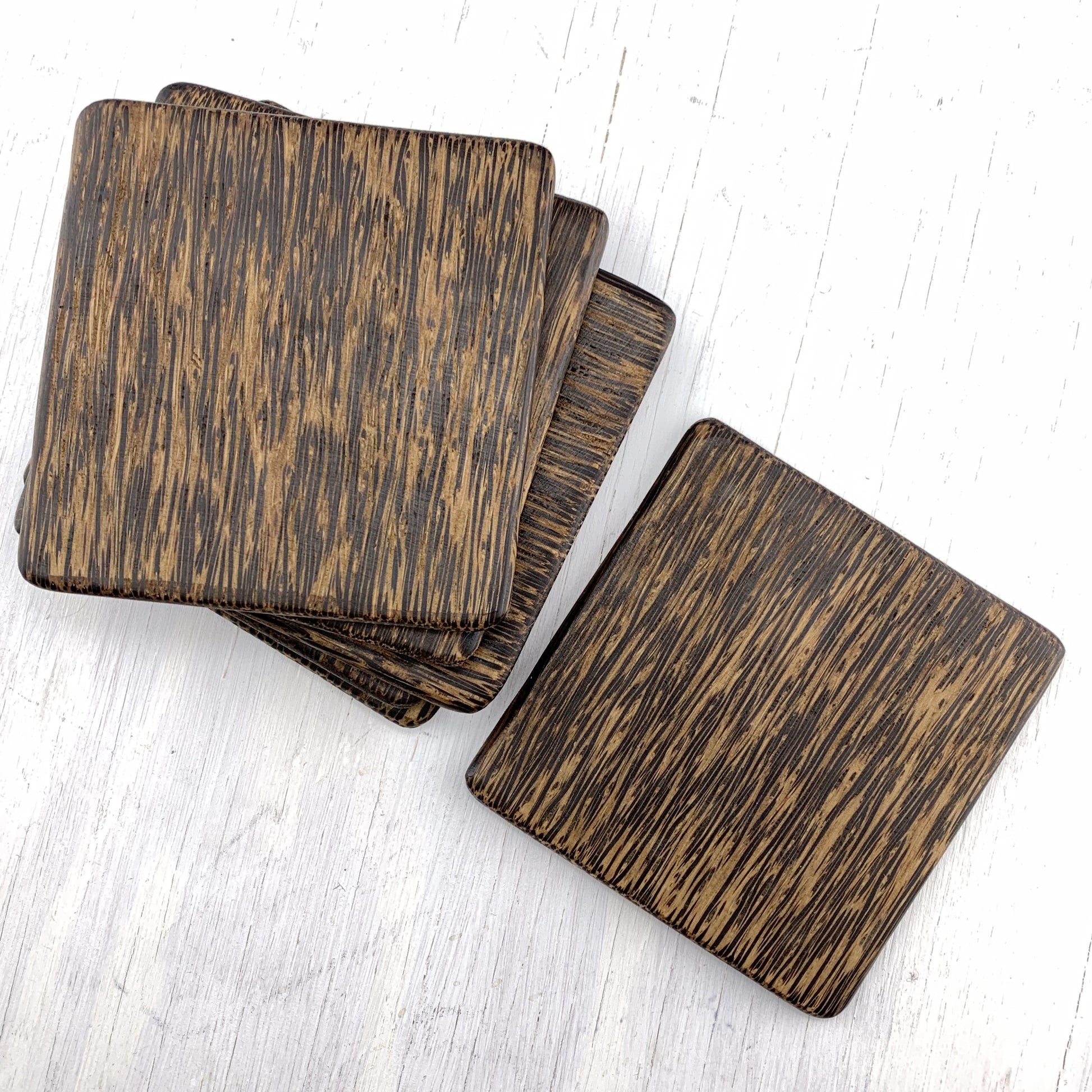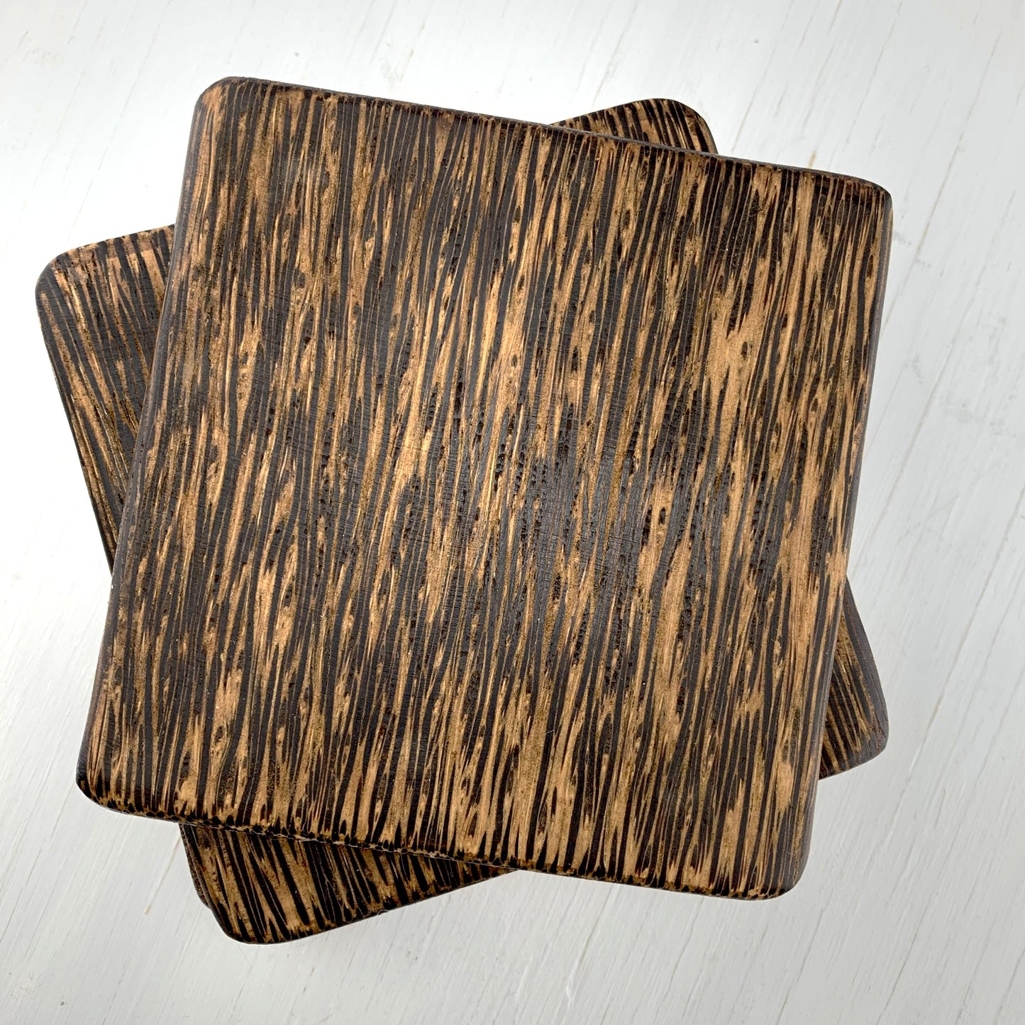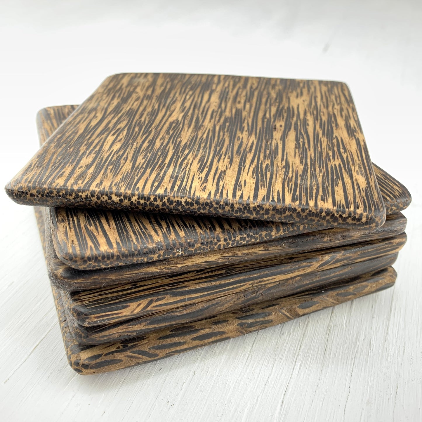 This set of six palm wood - coconut, not oil palm - coasters is simple, handsome, and eco-friendly. Made by an artisan cooperative, these coasters feature the beautiful natural grain of the fast-growing, sustainably sourced wood.