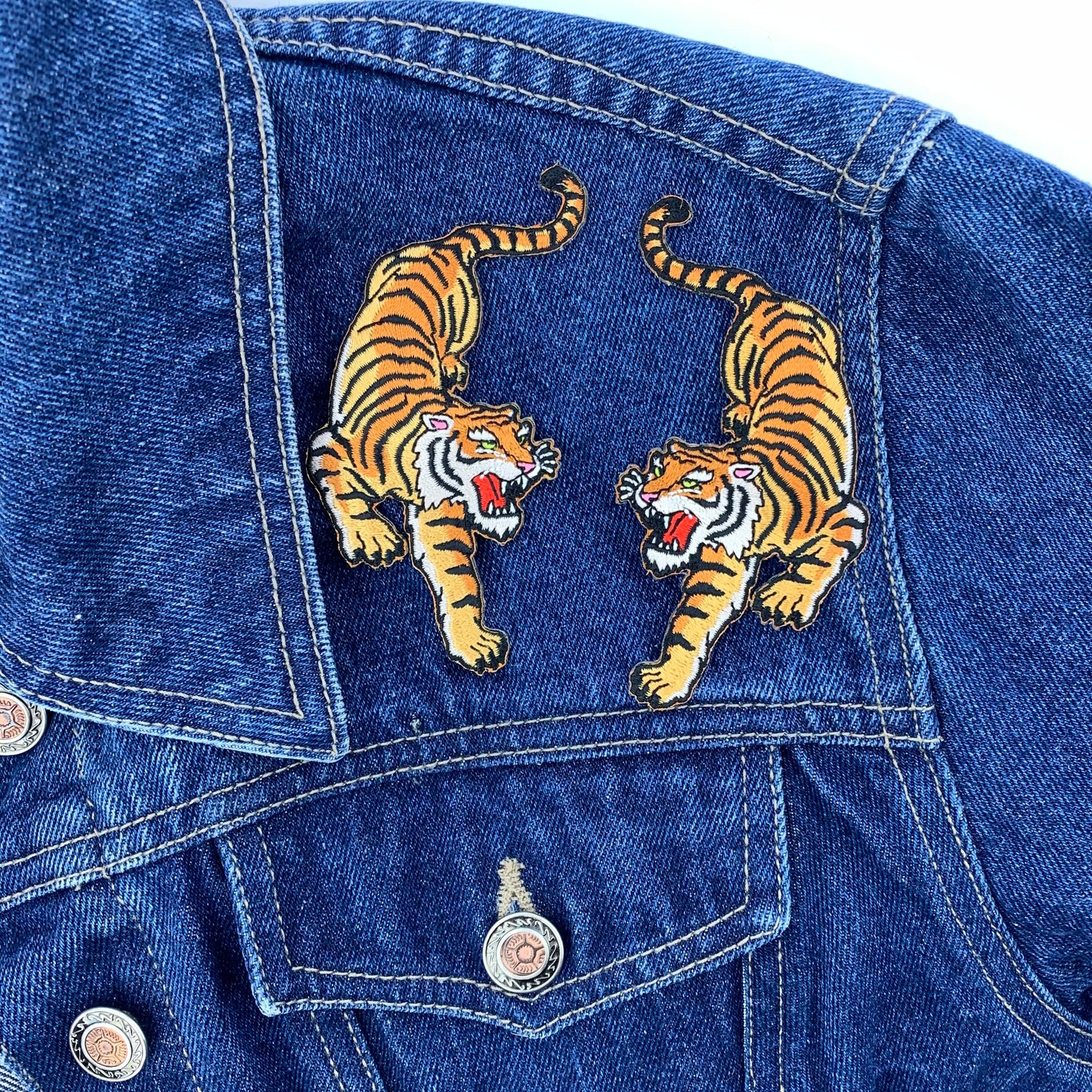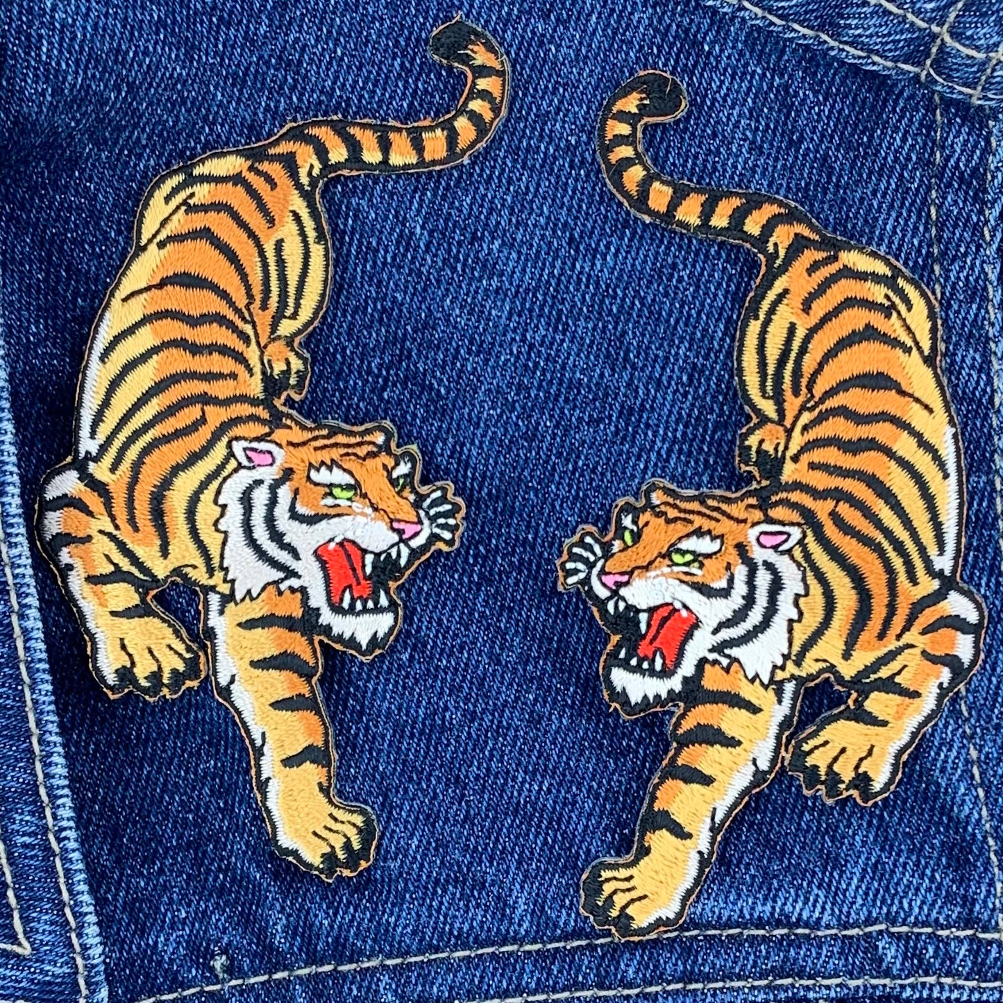 Tiger patches are sold together, (they look great on lapels or pockets, as an idea!) and are approximately 4" L x 2" W