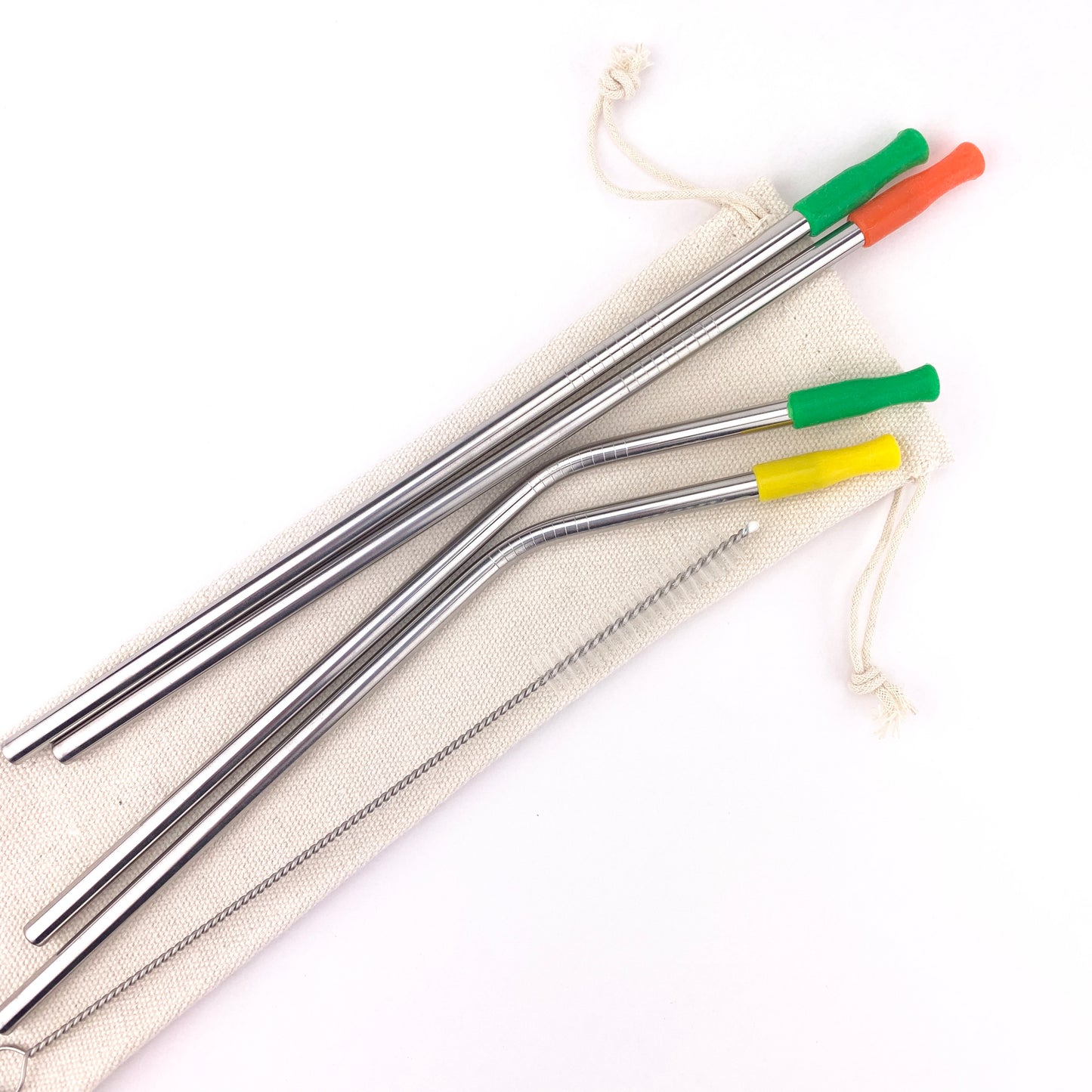 We all know that disposable straws are out, and eco-friendly reusable straws are the way to go. This set of reusable food grade 304 stainless steel straws includes: 2 straight straws, 2 angled straws, 4 silicone tips, 1 cleaning brush and 1 canvas drawstring bag. Straws are 8 1/2 inches long. So handy!