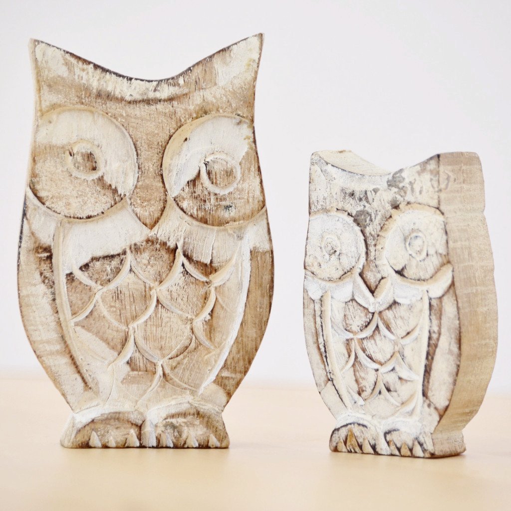 For owl lovers! These charming little wooden owls come from a Fair Trade organization in Northern India. Hand-carved from sustainable and eco-friendly mango wood, then given a white distressed finish to really bring out the carving, these little owls look great on a bookshelf, mantel or side table where they can wisely watch over you.